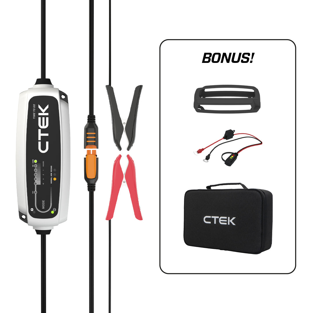 Ontdek de CTEK CT5 Time To Go acculader kit - het perfecte pakket voor het onderhouden van uw accu. Deze complete kit bevat alles wat u nodig hebt om uw accu in topconditie te houden, alles stijlvol gepresenteerd in een hoogwaardige, stevige tas. Dit all-in-one pakket is ideaal voor bootliefhebbers, autoliefhebbers, techneuten en iedereen die waarde hecht aan het onderhoud van zijn voertuigaccu.