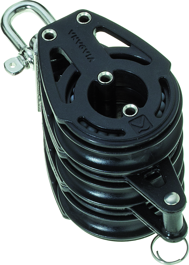 Viadana 3-schijfs blok 12 mm. Is geschikt voor lijnen tot 12 mm, heeft een hondsvot en een totaal belasting van 1080 daN.