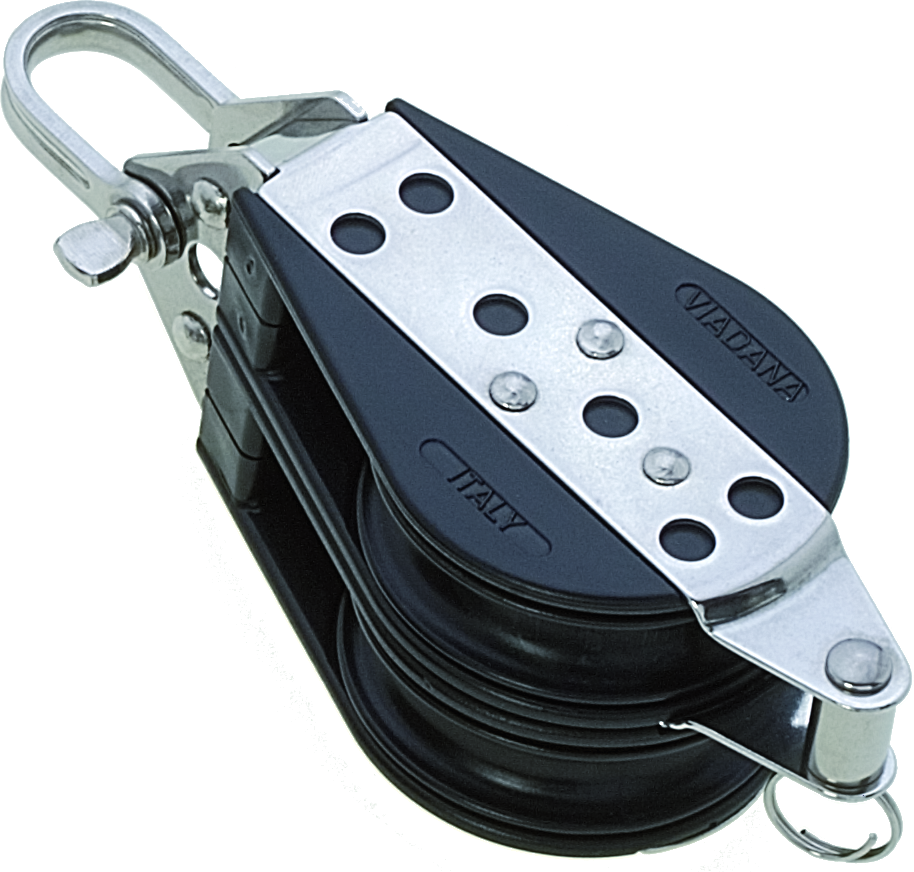 Viadana 2-schijfs blok 12 mm met hondsvot. Geschikt voor lijnen tot 12 mm en belastbaar tot 1000 daN.
