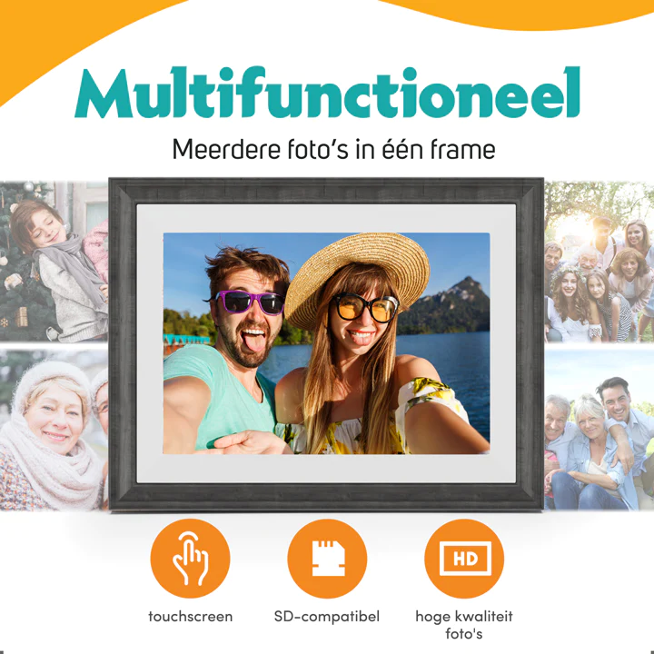 (1280x800 pixels) met touchfunctie voor eenvoudige bediening. De fotolijst kan via Wifi met
