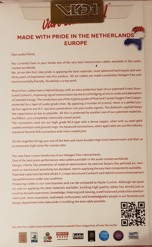 De Van den Hul The Bay C5 Hybrid is een hoogwaardige analoge audio interlink kabel gebasseerd op de True Transmission technologie, een hybride ontwerp, halogeenvrij. De Bay C5 Hybrid is speciaal ontworpen voor algemene doeleinden en auto-hifi-interlinktoepassingen en kan ook perfect dienen als interne (voor)versterker- en mengpaneelbedradingstoepassingen en als ongebalanceerde patchbay-interconnect. De ontwerpcombinatie van een superieure transmissiekwaliteit, een lage geleider-geleidercapaciteit, een zeer hoge afschermingsfactor samen met een hoge mechanische flexibiliteit en een lange levensduur, zorgen voor een hoogwaardige kabel tegen een aantrekkelijke prijs. Het hoogwaardige geleidermateriaal dat in deze kabel wordt gebruikt, is groot kristal OFC met een dichte zilveren coating. De Bay C5 Hybrid is bovendien volledig uitgerust met Linear Structured Carbon (LSC) verzadigde lagen die standaard in de duurdere kabelproducten van Van den Hul zitten. Deze lagen verbeteren de transparantie en beeldvorming drastisch. Door eventuele metalen cystal-defecten elektrisch te overbruggen, wordt een stabiele geleidbaarheid bij de laagste signaalniveaus verkregen. De coaxiale constructie is gemaakt met een middengeleider van 40 x 0,12 mm. strengen met een effectieve dwarsdoorsnede van 0,452 mm² (AWG 20,6) en een weerstand van 3,8 Ohm/100 meter. De middengeleider is gecoat met een laag LSC en is geïsoleerd met geschuimd polyethyleen. De kabelcapaciteit is 110 pF/m. Het dubbele scherm is gemaakt van een 16 x 6 x 0,12 mm. geslagen vlechtwerk met daaronder een Linear Structured Carbon verzadigde laag om de kabel verder af te sluiten tegen HF-signalen en de signaalkwaliteit drastisch te verbeteren. De totale weerstand van het scherm is 1,6 Ohm/100 meter. De externe 5,2 mm. diameter jacket is gemaakt van rood gekleurd HULLIFLEX 4, een materiaal met superieure eigenschappen vergeleken met b.v. PVC; HULLIFLEX geeft de BAY C5 HYBRID een zeer lange levensduur zonder verouderingseffecten.