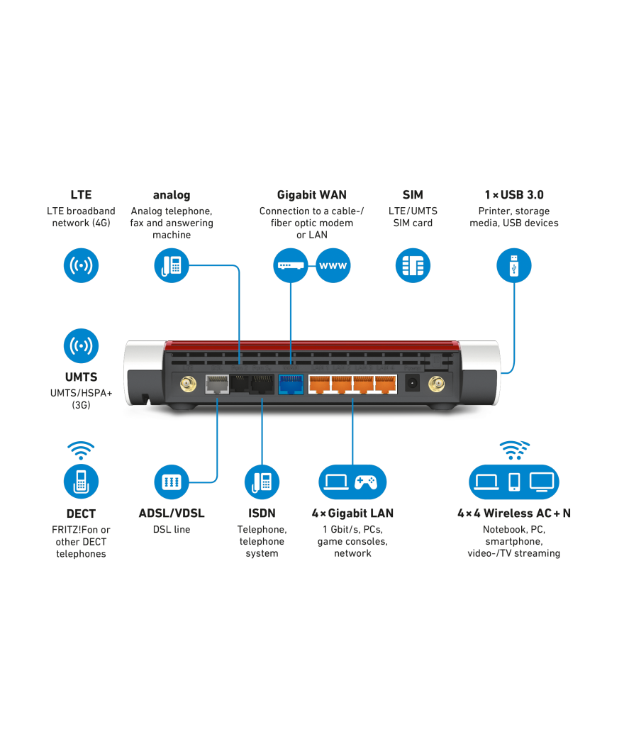 De FRITZ!Box 6890 LTE van AVM is de eerste router die zowel op DSL-aansluitingen als in het mobiele netwerk ingezet kan worden. Voor de verbinding met internet is zowel een geïntegreerde 4G-/3G-modem als een VDSL-modem (incl. supervectoring 35b) voor snelheden tot 300 MBit beschikbaar. De modernste high-end WiFi AC+N zorgt voor nog meer reikwijdte en aanzienlijk hogere snelheden van tot 2.533 Mbit/s. Met het vertrouwde comfort verbindt de FRITZ!Box 6890 LTE alle computers, smartphones, tablets, televisies, printers en andere netwerkapparaten met het thuisnetwerk. Gigabit-LAN, USB 3.0 en de telefooncentra