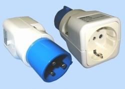 Adapter van CEE naar wandcontactdoos met randaarde. De wandcontactdoos met randaarde is 16A, afm. l x b x h = 105x52x52 mm