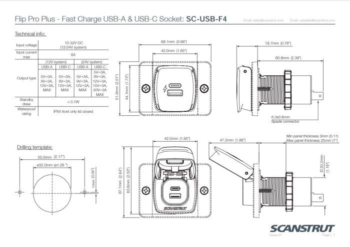 ScanStrut Flip Pro Plus snellader IPX4 waterdicht USB-A en USB-C aansluiting 12-24 V