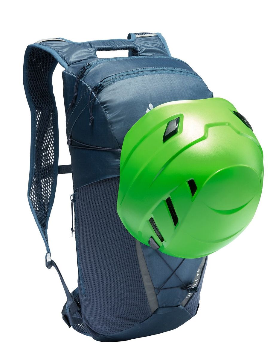 Of het nu op de voet of te voet is - de met 380 g zeer lichte Uphill 12 fietsrugzak is altijd een betrouwbare metgezel. Ondanks de minimalistische uitrusting kunnen fietsers vertrouwen op volledig comfort. Naast het asymmetrisch openende hoofdvak met 12 l volume bieden een plat, rekbaar netvak evenals een met ritssluiting beveiligd zijvak toegang tot de mobiel of de reep, zonder de lichte fietsrugzak af te hoeven doen. De vetersluiting aan de voorkant heeft een drievoudige functie: opbergen van een wind- of regenjack met een volle rugzak; compressie bij minder bagage en bevestigingsmogelijkheid voor wandelstokken. 3D-mesh op de achterkant en de schouderbanden zorgt voor een constant goede ventilatie tijdens het biken of wandelen. Doordacht in het ontwerp geïntegreerde, reflecterende elementen, een drinksysteemuitgang en de regenhoes in de opberghoes ronden de eigenschappen van deze universeel te gebruiken rugzak af. Alle materialen hebben een hoog gerecycled gehalte. Voor het ultralichte, gesiliconiseerde basismateriaal van deze lichte rugzak wordt een gecertificeerd massabalansproces gebruikt. Hierbij wordt uit oude banden pyrolyse-olie gewonnen, dat bij de conventionele productie van polyamide wordt toegevoegd. Dankzij de chemische recycling wordt tot 60% CO2 bespaard. Daarnaast is dit product klimaatneutraal: de emissies afkomstig van materialen, productieproces en verzending werden holistisch bepaald en systematisch verminderd. Thans niet vermijdbare emissies werden volledig via de onafhankelijke non-profitorganisatie "myclimate" gecompenseerd. Het VAUDE Green Shape-label staat voor een milieuvriendelijk, functioneel product uit duurzame en bluesign®-gecertificeerde materialen.