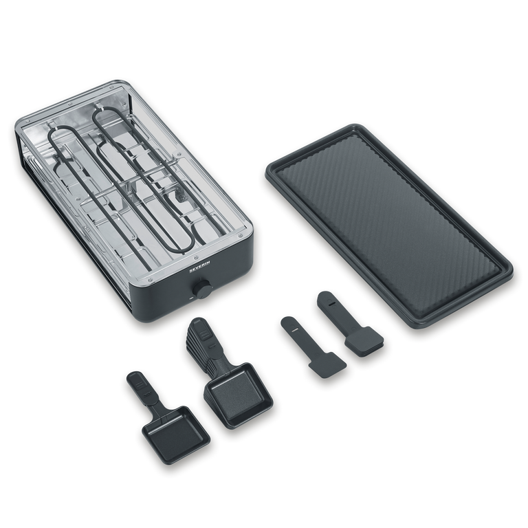 Raclette grill met 8 pannetjes met antiaanbaklaag en click-stop functie. Plus een hoogwaardig grilloppervlak met keramische coating, perfect voor vlees, vis of groenten. Inclusief parkeerniveau voor het plaatsen van hete of ongebruikte pannetjes. Variabele temperatuurinstelling met LED-verlichting en extra diepe pannetjes van 20 mm voor optimale vulling.