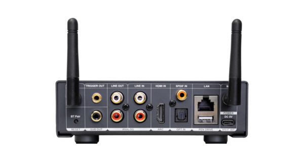 * Uitgangen: coaxiaal (USB Type-C), lijnuitgang, 3,5 mm hoofdtelefoonversterker, 12V