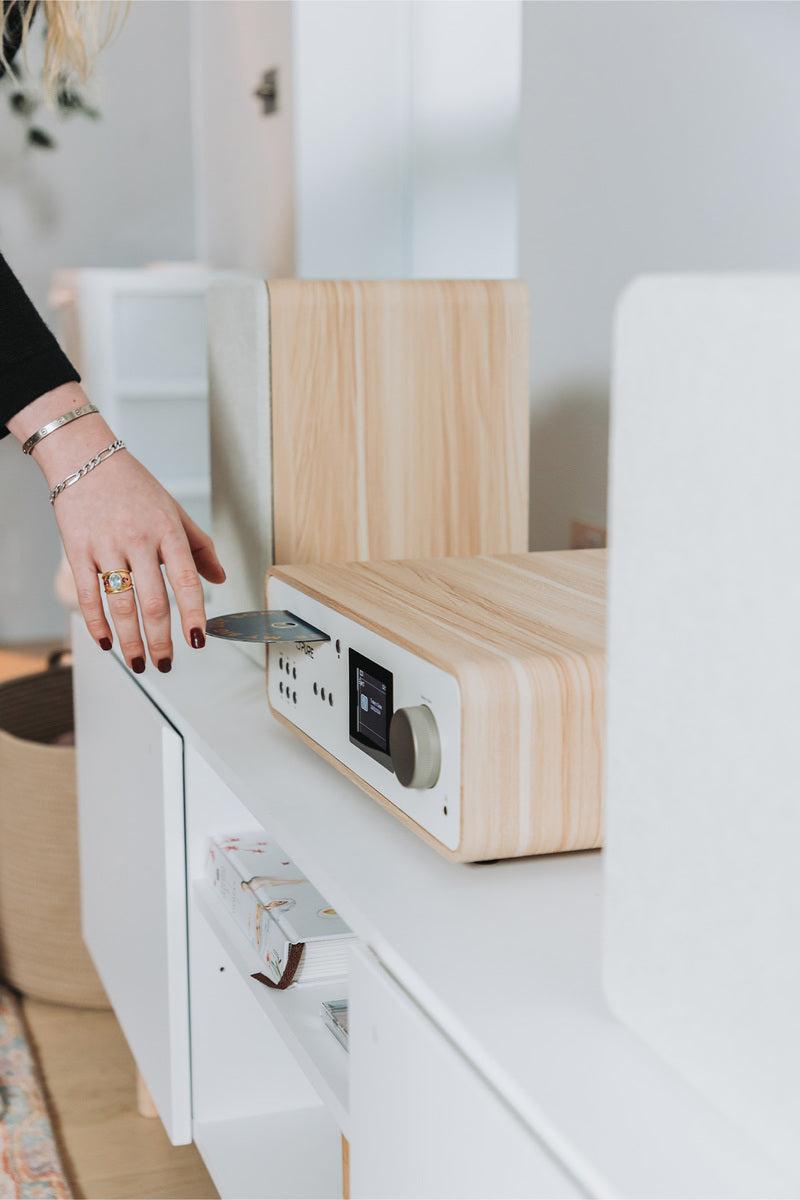Met zijn slanke vorm en de twee beschikbare kleuren (licht Wit Katoen/eiken en donker Koffie Zwart/noten) past onze stereo-installatie perfect in elke klassieke of moderne woonkamer, of hij nu op een plank staat of los wordt gebruikt.