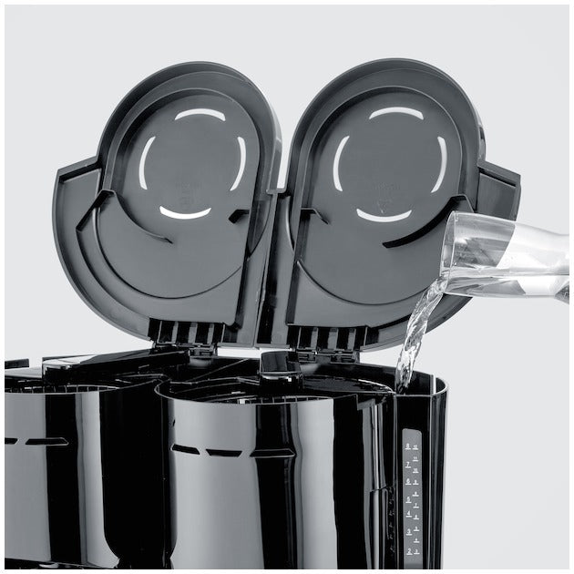 Met dit apparaat kun je twee kannen koffie tegelijk zetten, elk met 8 kopjes, waardoor het ideaal is voor kantoren, pensions of restaurants. Twee thermoskannen met praktische doorzetdeksels garanderen langdurig heet koffiegenot. Met twee waterniveau-indicatoren aan de voorkant is de bediening handig en biedt het beste overzicht. Het apparaat heeft ook een geïntegreerd kabelcompartiment voor het eenvoudig opbergen van het aansluitsnoer.