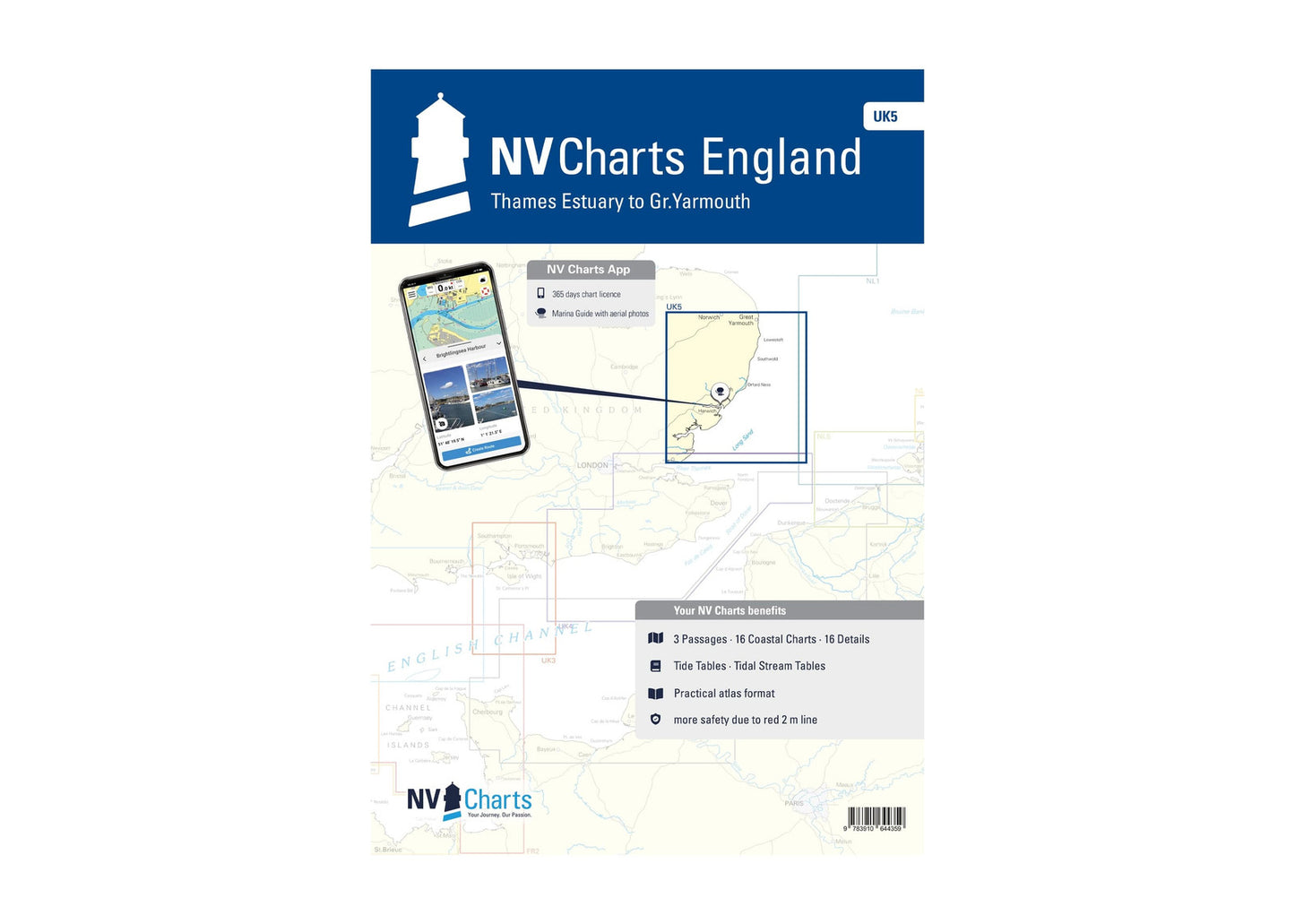 De UK5 is geschikt voor hen die vanuit Nederland richting de Engelse oostkust boven Londen willen vertrekken. Maar ook wie de kust verder noordwaarts wil verkennen vanuit de richting Sussex is met deze atlas goed uitgerust. De kust van Suffolk en Essex inclusief de monding van de Theems wordt met deze set bestreken. Steden als Harwich Ipswich en Lowestoft zijn ook in deze atlas te vinden.