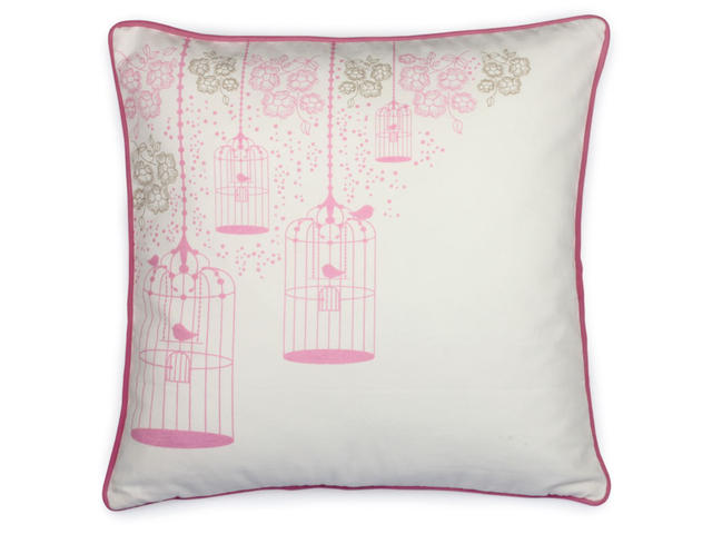 Een kussen met een mooie bedrukking van een vogelkooi waardoor u een huiselijke sfeer creëert in uw interieur.