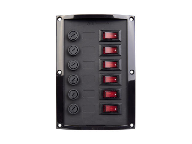 Verticaal schakelpaneel 12 Volt met 6 schakelaars. Dit schakelpaneel is compleet met 5 Amp glaszekeringen, verlichte schakelaars, aanduidingen op sticker en bevestigingsmateriaal.Afmetingen 165 x 115 mm.
