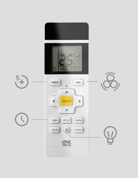 Modern ontwerp met een verlicht LCD-scherm, de One For All Aircon-afstandsbediening is compatibel met de meest populaire airconditionermerken.