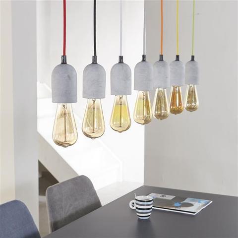 Hanglamp Sette Globi is een prachtige 7-lichts lamp uitgevoerd in helder glas met beton-armaturen. Maar er is meer. Sette Globi heeft namelijk kabels in allemaal verschillende kleuren. Kleuren die passen binnen het Mioni-concept. Hanglamp Sette Globi is daarom continu te combineren met een van onze andere lampen, stoelen of bijzettafels. De kleur is altijd een match! De lamp hangt mooi boven een grote eetkamertafel. Voor een mooie sfeer boven uw eetkamertafel adviseren wij een kooldraadlamp, die niet is inbegrepen, te gebruiken. Deze kunnen wij eventueel apart erbij leveren.