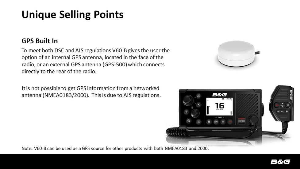 Ga met de B&G V60-B marifoon veiliger het water op danzij de klasse B AIS-transceiver en ingebouwde GPS. Zie en word gezien door nabijgelegen AIS-uitgeruste schepen dankzij een geïntegreerde klasse B AIS-transceiver en voeg maximaal twee optionele draadloze handsets toe om overal verbonden te blijven.