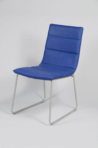 Het heeft horizontale stiknaden en een dun gebogen frame van RVS.