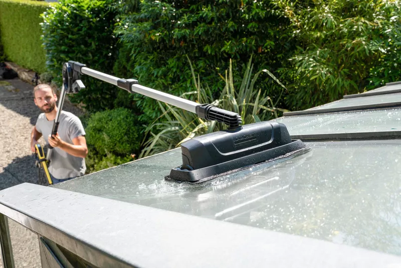 Met de telescopische spuitlans kunnen zelfs moeilijk toegankelijke plaatsen zoals hoge gevels snel en moeiteloos worden gereinigd. Het 180 graden verstelbare scharnier is een ander voordeel en maakt het schoonmaken van serres, schuine daken en carports mogelijk. Door gebruik met het gevel- en glasreinigingsopzetstuk worden moeilijk bereikbare plaatsen gelijkmatig en effectief gereinigd: de vier hogedruksproeiers verwijderen hardnekkig vuil op verschillende oppervlakken.