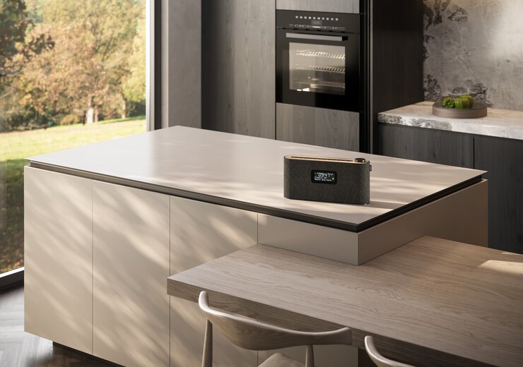 Ter gelegenheid van het 100-jarig bestaan van Radio Frequenz GmbH biedt de Loewe radio.frequency draagbare radio met de modernste technologie en een uniek design met inlegwerk van natuurlijk eikenhout.