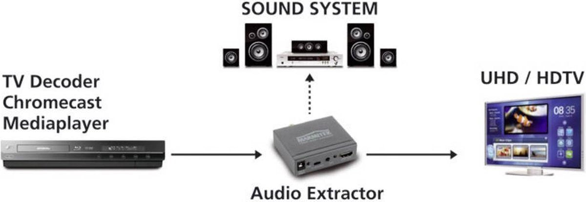 Zo is de connector ook goed voor het aansluiten van HDMI bronnen aan audio-apparatuur zonder eigen audio-uitgang zoals van jouw Chromecast, Wii U, Media Players).