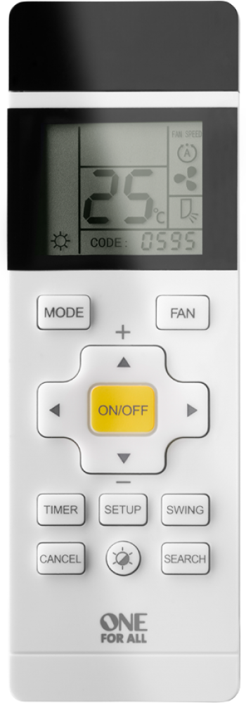 Modern ontwerp met een verlicht LCD-scherm, de One For All Aircon-afstandsbediening is compatibel met de meest populaire airconditionermerken.