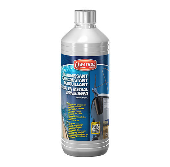 Owatrl Owayell verwijdert gele vlekken, kalkaanslag en roestvlekken van gelcoat, roestvrij staal, etc. Het lost kalk-, zeezout- en watersporen op en reinigt en vernieuwd antislip- oppervlakken. verwijdert strepen en roestsporen en herstelt de glans van rvs, geanodiseerd aluminium en verchroomde oppervlakken. Eenvoudig in gebruik en snelwerkend.