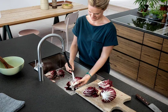 Losse kraan Flex, koud, warm en kokend-water-kraan met kindveilige (dubbel)druk-draai bedieningsknop en uittrekbare perlator, Roestvrijstaal.