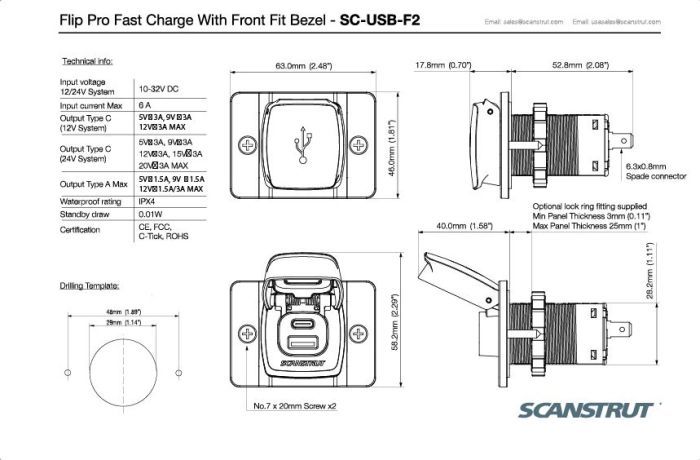 Scanstrut Flip Pro is voorzin van een 12V of 24V-ingang en heeft 1x USB-A- en 1x USB-C-oplaadpoort. Wanneer de snellader niet wordt gebruikt, zorgt de veerbelaste afdekking voor een goede bescherming tegen weersinvloeden. De Flip Pro heeft een compacte grondplaat, is gemaakt van eersteklas materialen van maritieme kwaliteit en is IPX4 waterdicht. Flip Pro is SNEL! Het laadt op tot 36W op een 12V-systeem of tot 60W op een 24V-systeem. Hierdoor is hij perfect voor het opladen van moderne laptops via de USB-C poort. Hij is ook 2x sneller voor het opladen van grote tablets en is ontworpen om zowel een iPad Pro als een iPhone moeiteloos tegelijkertijd op te laden.