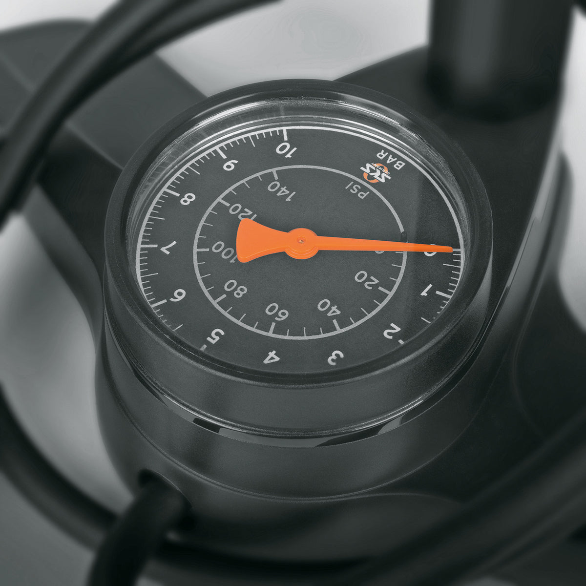 De grote en overzichtelijke precisiemanometer geeft je in één oogopslag inzicht in de bandenspanning, met een bereik tot maar liefst 10 bar (145 PSI). Of je nu een racefiets, stadsfiets of mountainbike hebt, je banden zijn altijd perfect opgepompt.