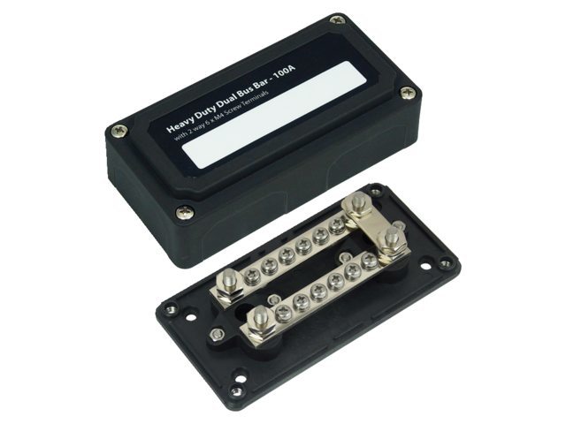 Heavy duty busbar (nylon glassfiber versterkt) voorzien van 4 M6 studs en 12 M4 schroef terminals. De kap heeft zes uitneembare delen om montage van de kabels uit diverse hoeken mogelijk te maken. Door de specifieke maatvoering is deze busbar makkelijk te combineren met de mini-accuschakelaars (14.452.145 & 14.452.146), de heav duty ANL zekeringhouder (14.425.946) en de heavy duty busbar (14.425.947)