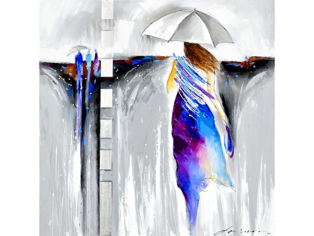 Een modern abstract schilderij met een figuratief detail van een vrouw met een paraplu.