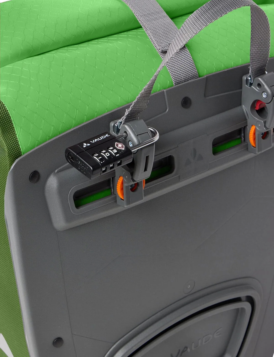 De grote, wijde wereld verkennen! Deze waterdichte fietstas voor achterop wordt van robuust, PVC-vrij canvasmateriaal klimaatneutraal in de Duitse VAUDE-locatie in de buurt van de Bodensee gemaakt en wil graag samen met jou lange reizen maken. Dankzij de wikkelsluiting kan hij op maat worden gebracht en absoluut dicht worden afgesloten. Voor overzichtelijkheid zorgen een gemakkelijk binnenvak, evenals het opgelaste buitenvak. Deze fietstas wordt met het QMR 2.0-systeem en stabiele achterplaat rechts of links op de achterbagagedrager bevestigd, is middels een gemakkelijk bedienbare draaiknop verstelbaar en laat zich snel en gemakkelijk afnemen. Met een klein beugelslot kan hij rechtstreeks op de QMR-haak worden vergrendeld. Met reflecterende elementen. Inbegrepen: een tas met een volume van 25 l. Kan met deze praktische accessoire-tassen uitgebreid worden: Toolbag Back, Sortyour Back, Addita Bag.