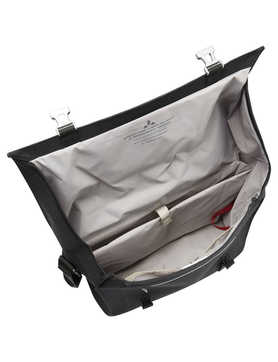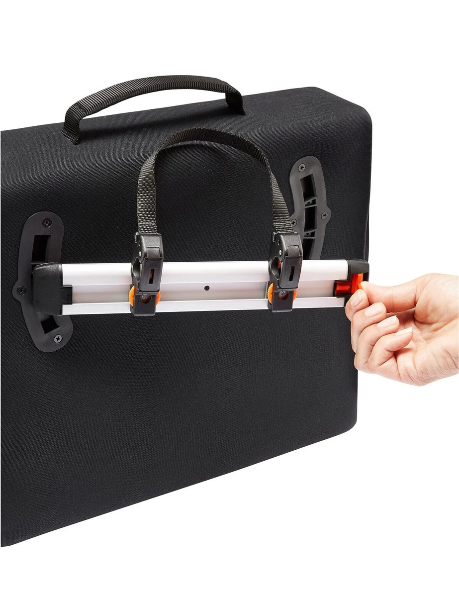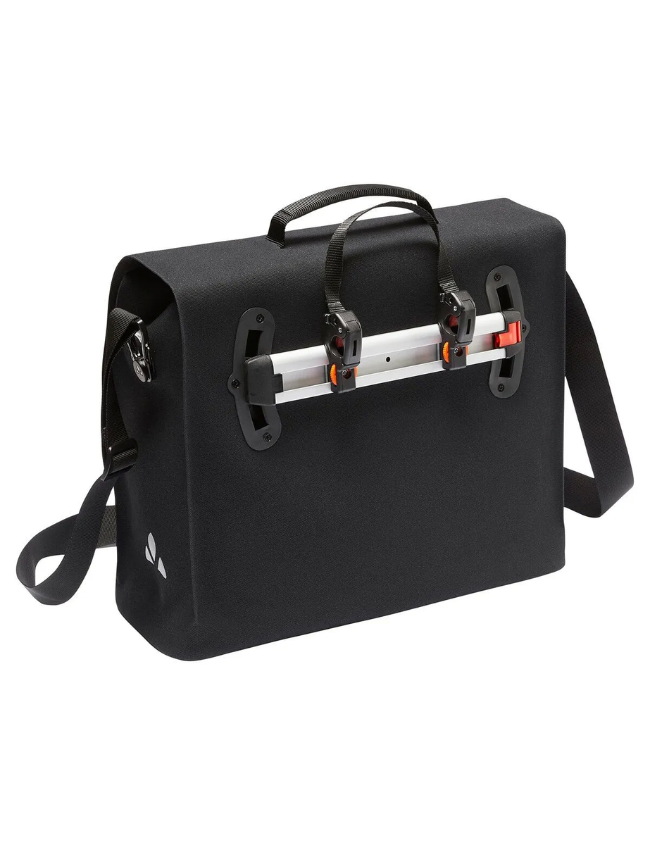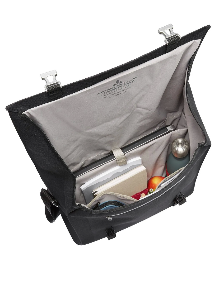 De Vaude middelgrote achterfietstas Bayreuth L in aktetasformaat is van robuust polyamidmateriaal met een textiel-look gemaakt, is waterdicht gelast en volledig PVC-vrij. De 15" laptop is in het gepolsterde vak goed beschermd; andere a$-documenten vinden in het hoofdvak een plekje. Overzichtelijk is het felgekleurde binnenmateriaal: een sleutelhouder, een gepolsterd mobiel-vak, pennenhouder en een lus voor het plaatsen van een drinkfles completeren het binnenontwerp. Middels de verstelbare Plug and Ride-bevestigingsrail wordt de tas op het fietsbagagedrager (tot 16 mm diameter) gemonteerd en er vanaf gehaald, wat snel en eenvoudig met de hand gaat. Met een klein beugelslot (bijv. VAUDE TSA Combination Lock II, niet bij de levering inbegrepen) kan de fietstas rechtstreeks op de QMR-haak worden vergrendeld. De kleine "voetjes" aan de onderkant zorgen voor een goede stand, met de draaggreep of met de goed gepolsterde schouderbanden kan de tas comfortabel te voet worden vervoerd. Reflecterende elementen aan de voorkant en zijkanten zorgen voor verhoogde zichtbaarheid. Deze fietstas wordt op het hoofdkantoor van VAUDE in Zuid-Duitsland met behulp van hoogfrequente technologie geproduceerd, helder ontwerp en hoogwaardige Made in Germany-kwaliteit zijn inclusief.