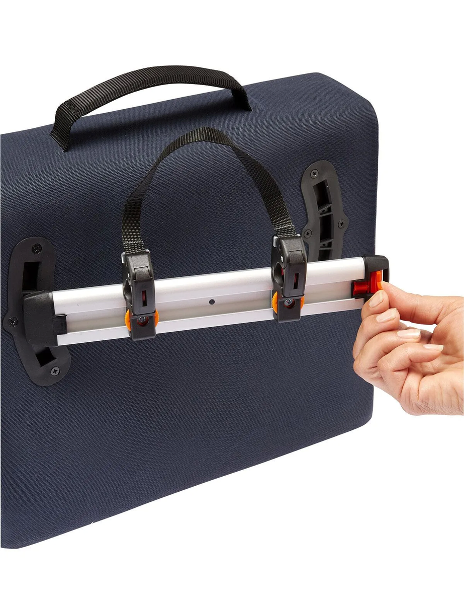 De Vaude aktetas voor op de fiets. De middelgrote achterfietstas Bayreuth M in aktetasformaat is gemaakt van robuust polyamidmateriaal met een textiel-look, is waterdicht gelast en volledig PVC-vrij. De 13" laptop verdwijnt goed beschermd in het gepolsterde vak naast andere A4 documenten, die in het hoofdvak een plekje vinden. Het felgekleurde binnenmateriaal zorgt voor goed overzicht: een sleutelhouder, een gepolsterd mobiel-vak, pennenhouder en een lus voor het plaatsen van een drinkfles ronden het binnenontwerp af. Middels de verstelbare Plug and Ride-bevestigingsrail wordt de tas op het fietsbagagedrager (tot 16 mm diameter) gemonteerd en er vanaf gehaald, wat snel en eenvoudig met de hand gaat. Met een klein beugelslot (bijv. VAUDE TSA Combination Lock II, niet bij de levering inbegrepen) kan de fietstas rechtstreeks op de QMR-haak worden vergrendeld. De kleine "voetjes" aan de onderkant zorgen voor een goede stand, met de draaggreep of met de goed gepolsterde schouderbanden kan de tas comfortabel te voet worden vervoerd. Reflecterende elementen aan de voorkant en zijkanten zorgen voor verhoogde zichtbaarheid. Deze fietstas wordt op het hoofdkantoor van VAUDE in Zuid-Duitsland met behulp van hoogfrequente technologie geproduceerd, helder ontwerp en hoogwaardige Made in Germany-kwaliteit zijn inclusief.