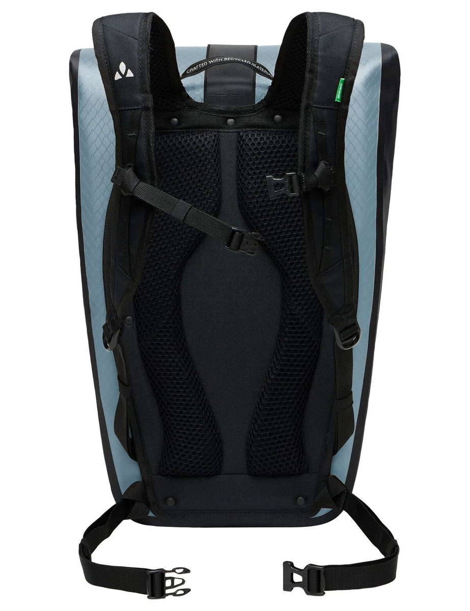 fietsrugzak met een inhoud van 17 liter de ideale metgezel. Hij heeft een ruim hoofdvak en een gepolsterd vak met ritssluiting voor een 13,3"" laptop. Hij wordt afgesloten met een rolsluiting, welke met klittenband wordt vastgezet. De opdruk reflecteert daar, net als het logo. Voor orde in rugzak zorgen de twee steekzakken en een keyring voor de voordeur of autosleutel. De gepolsterde, verstelbare schouderbanden en het rugsysteem maken deze rugzak van 17 liter aangenaam en comfortabel. Daartoe draagt ook het Vent-Comfort rugcontact-draagsysteem aan bij. Het gecoate materiaal evenals de praktische rolsluiting zorgen ervoor dat de rugzak waterdicht is en je geen extra regenhoes nodig hebt. De rugzak is gemaakt in Duitsland. Dit product is met Eco Finish zonder fluorkoolstoffen (PFC) milieuvriendelijk waterafstotend gemaakt. Het VAUDE Green Shape-label staat voor een milieuvriendelijk, functioneel product van duurzame materialen.