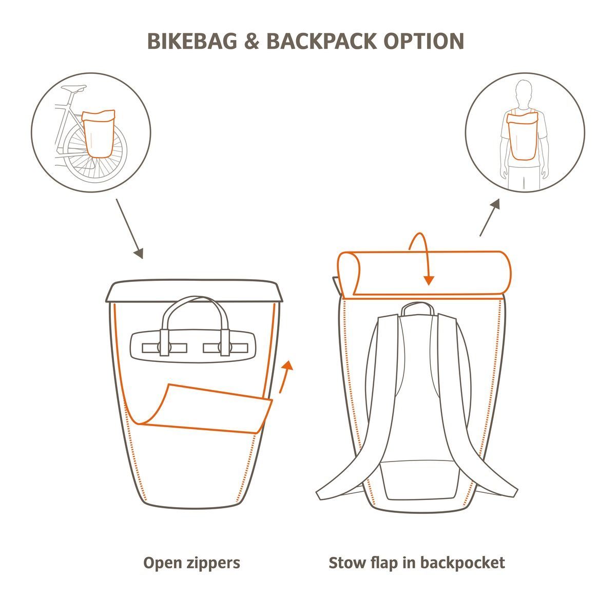 Rugzak of fietstas? Gewoon allebei! De Cycle 20 is de ideale begeleider voor forenzen, die tijdens het fietsen hun tas stevig op de fiets willen, maar dan in de trein, bus of de universiteit als rugzak willen dragen. De tas wordt met behulp van QMR-haken die met een slot te vergrendelen zijn (bijv. Abus-slot 145/20, niet inbegrepen), aan de bagagedrager bevestigd en is in een handomdraai tot rugzak omgebouwd. Daarvoor worden de beide verticale ritssluitingen geopend en het gehele bevestigingssysteem in een met klittenband afgesloten vak opgeborgen. De ombouwfunctie wordt op een ingenaaid, gemakkelijk te verwijderen etiket in een paar stappen uitgelegd. Deze slimme rugzak-fietstas-combinatie biedt echter nog meer. In het grote hoofdvak met plaats voor DIN A4-documenten helpt een gaas-organizer met ritssluiting de kleine zaken op hun plek te houden. Een apart, met ritssluiting af te sluiten, gepolsterd vak herbergt laptops tot 15,6". Aan de voorzijde bevindt zich een plat gaasvak voor het snel opbergen van tijdschriften of natte kleding. Een helmhouder evenals mooie reflecterende elementen die in het design zijn geïntegreerd, ronden de comfortuitrusting af. Het basismateriaal van de Cycle bestaat uit 50% gerecycled polyester, het contrastmateriaal zelfs voor 100%. Deze transformatiekunstenaar is met EcoFinish PFC-vrij waterafstotend afgewerkt. Het VAUDE Green Shape-label staat voor een milieuvriendelijk, functioneel product van duurzame materialen.