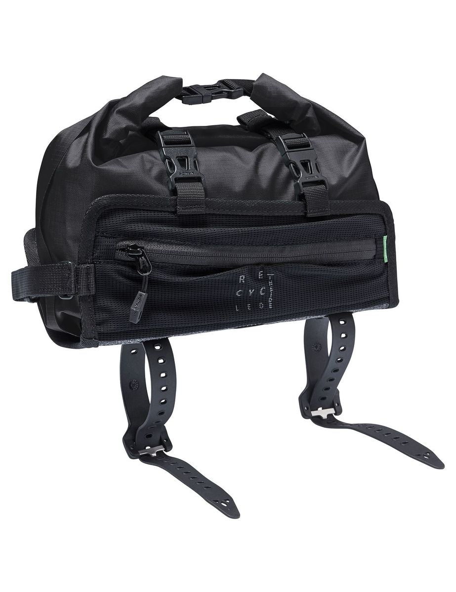 De Vaude Trailguide is een bikepackingtas, zoals in de boeken staat beschreven! Met zijn slanke, 3 l bevattende inhoud is hij het perfecte puzzelstuk voor iedereen die hun bagage verstandig op de fiets willen verdelen en veiligheid op prijs stellen. Hij bevat alle belangrijke zaken zoals reisdocumenten, smartphone of portemonnee, die je snel bij de hand en altijd in het zicht wilt hebben. De houder van de Trailguide wordt met 2 banden aan de bovenbuis bevestigd en met een klittenband aan de stuurbuis vastgezet om wegglijden te voorkomen. Twee kleine elastische zijvakken houden repen of Labello binnen handbereik. Deze waterdichte packsack is beveiligd met een ritssluiting en, afhankelijk van de belading - max. 3 liter - waterdicht ingepakt en met twee van steekgesp voorziene banden in de houder vastgezet. Als er tijdens een stop snel iets moet worden gekocht, kan de packsack snel uit de houder worden gehaald en met de meegeleverde schouderriem worden omgehangen. De bovenbuistas is niet alleen een praktische metgezel voor bikepacking. Hij doet ook heel veel werk op het gebied van milieubescherming, want zowel de bevestigingen als de packsack bestaan voor 100% uit gerecyclede materialen.
